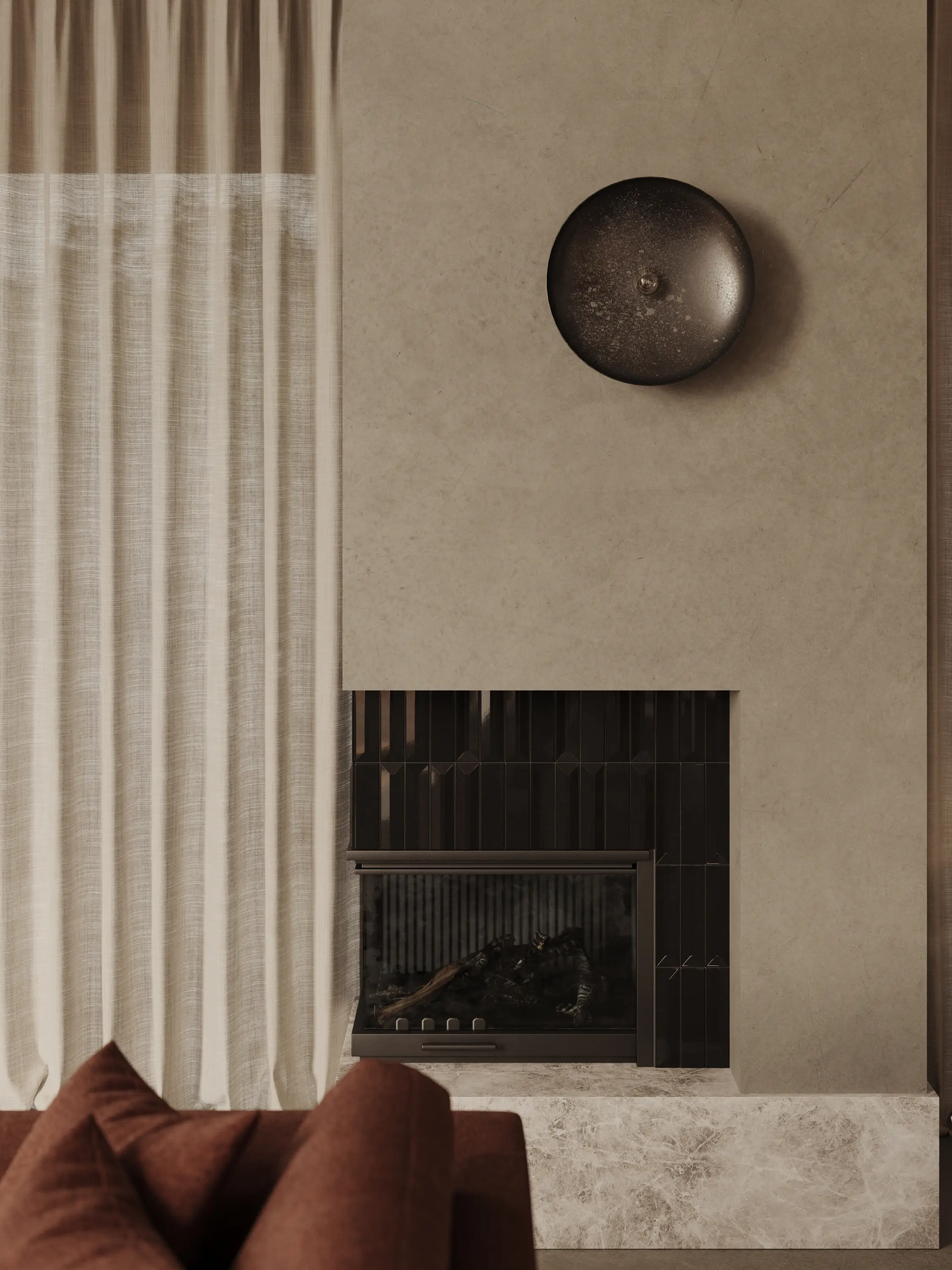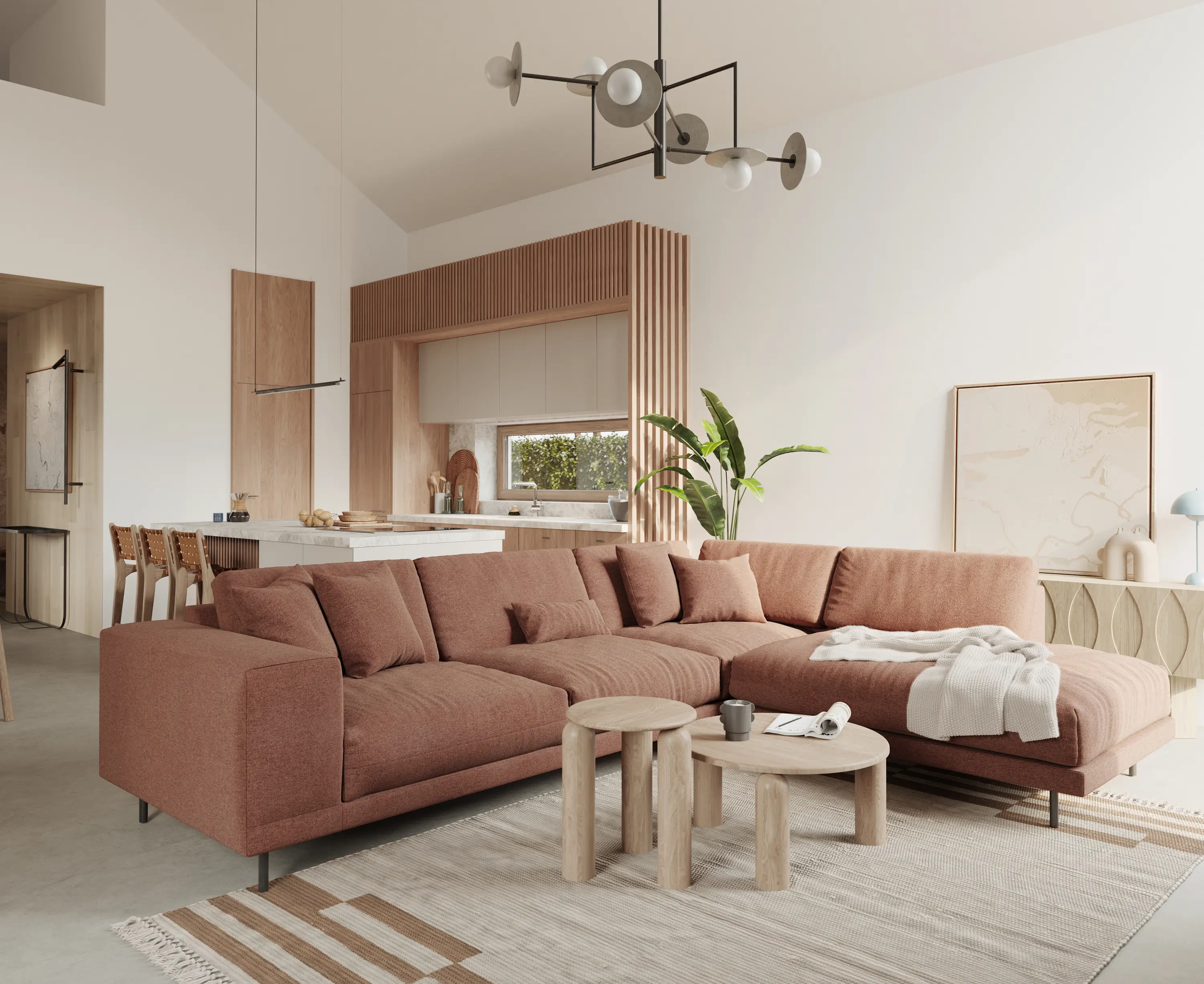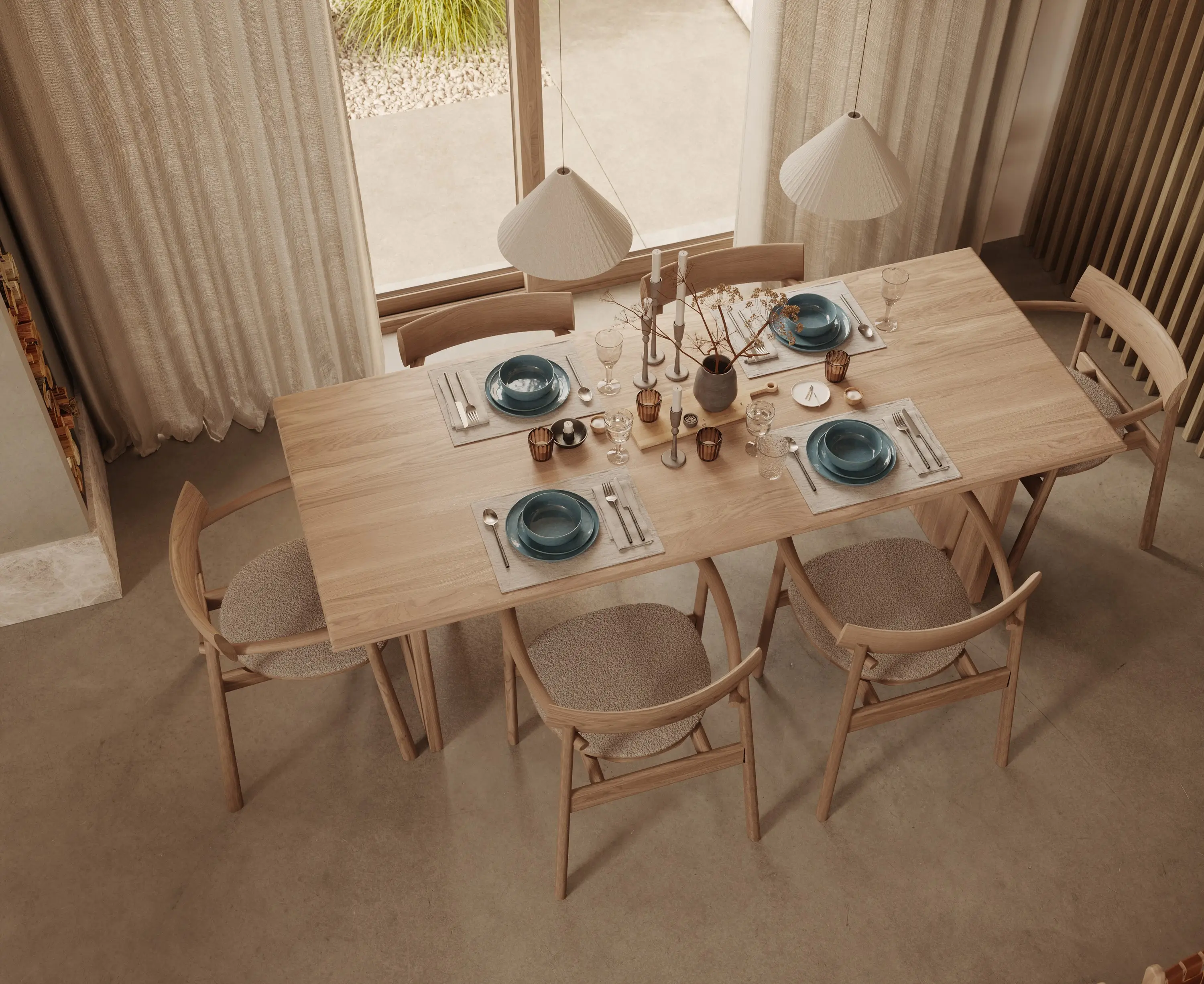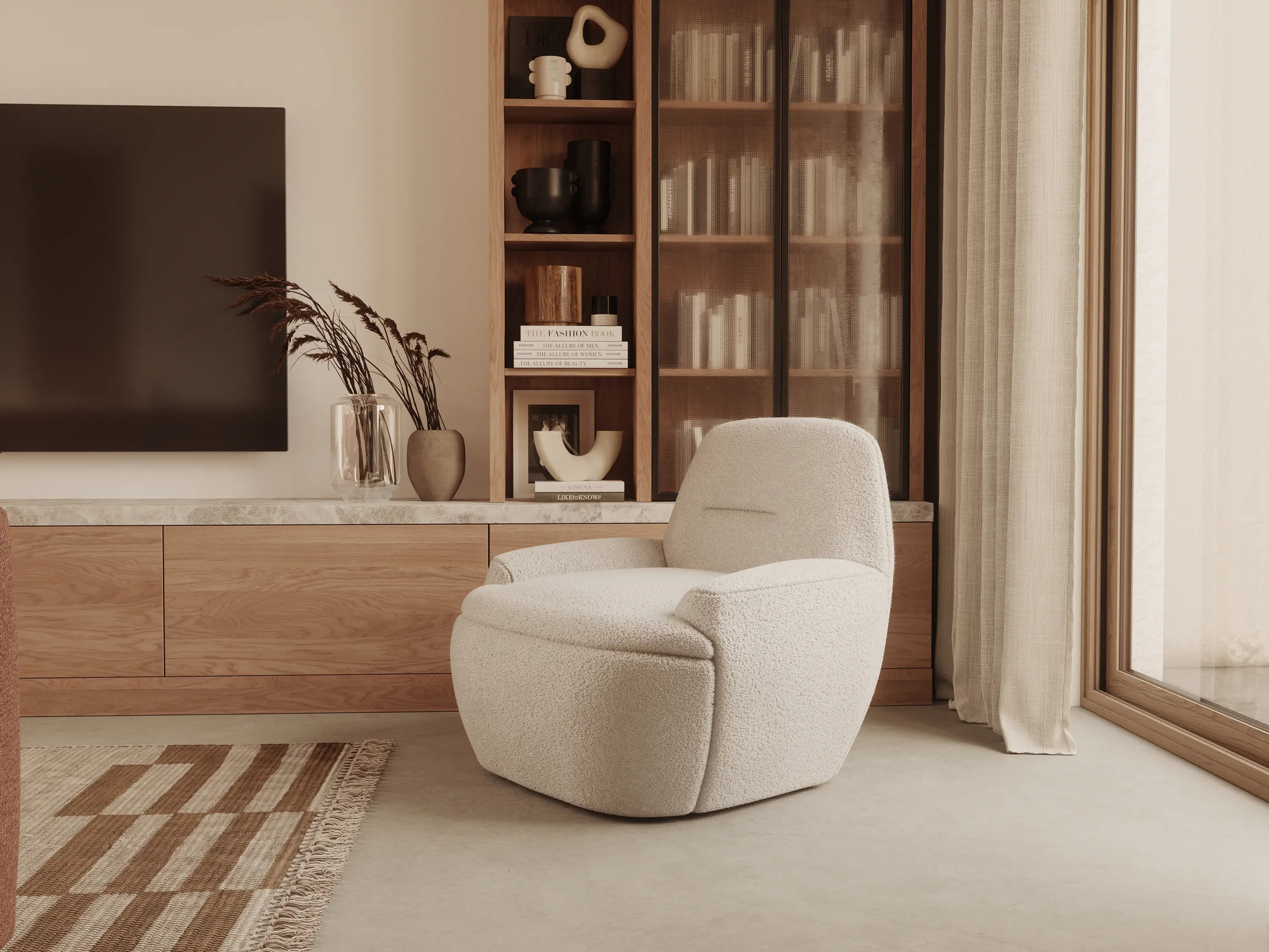 A photorealistic presentation of the interior design, reflecting every piece of furniture and every texture of the materials.