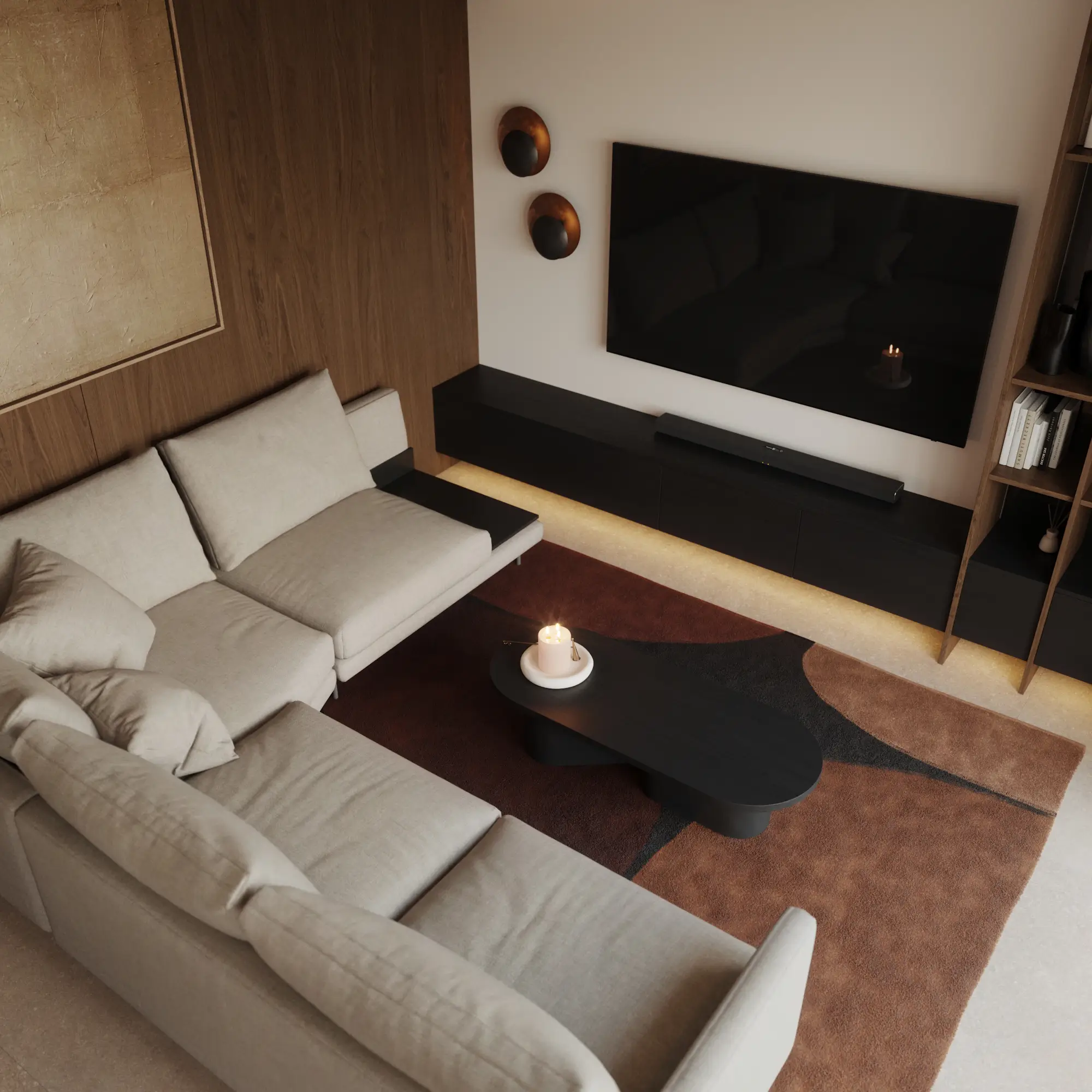 A photorealistic presentation of the interior design, reflecting every piece of furniture and every texture of the materials.